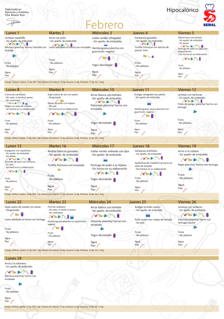 Empezado ya febrero y con un poco de retraso (pedimos disculpas), os informamos de los menús para este mes de Febrero. MENÚ NORMAL MENÚ DE RÉGIMEN