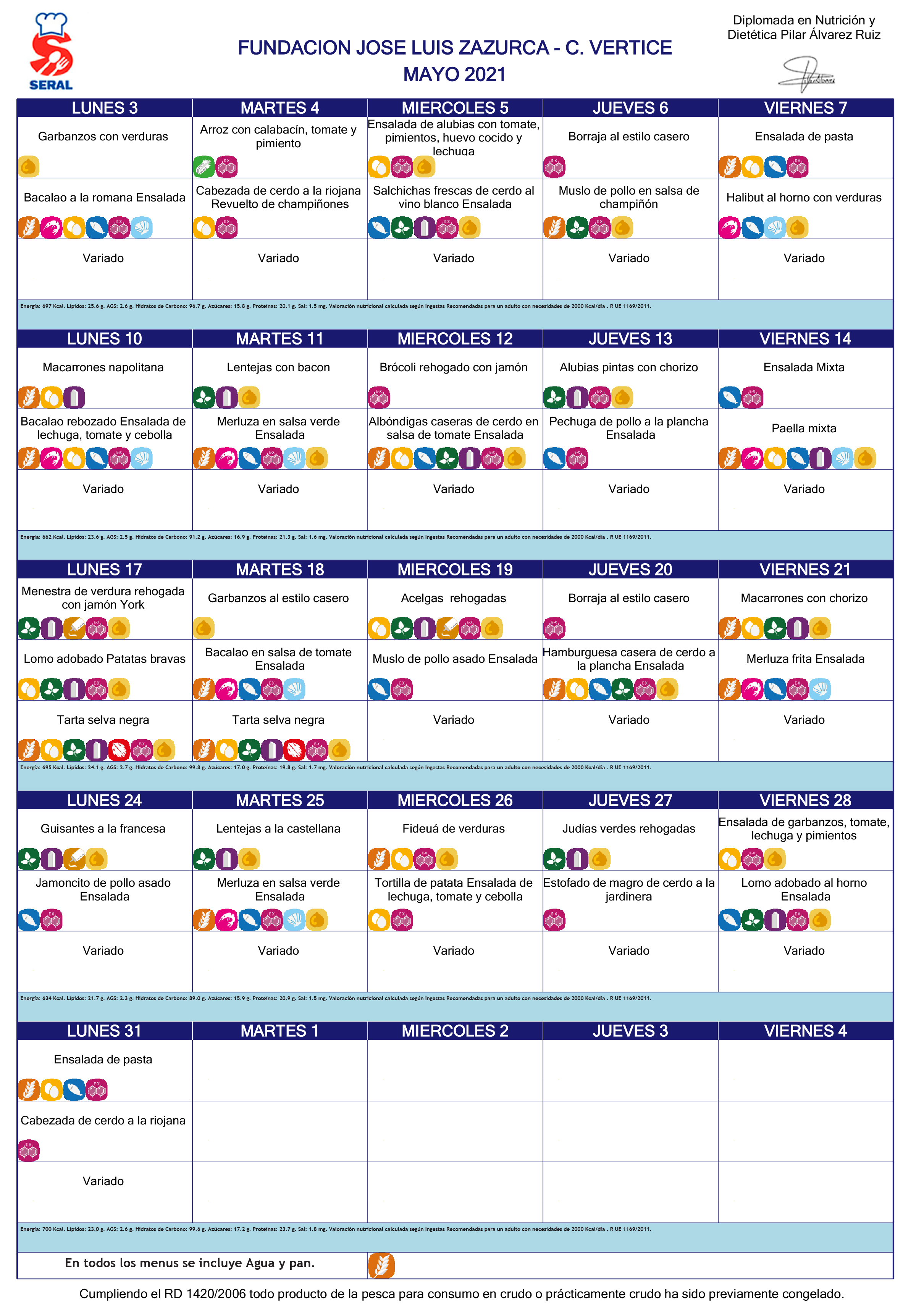 Buenas tardes, ya está aquí el menú del mes de mayo: Recomendaciones e información sobre el aporte nutricional de los menús e información sobre el aporte nutricional de los menús