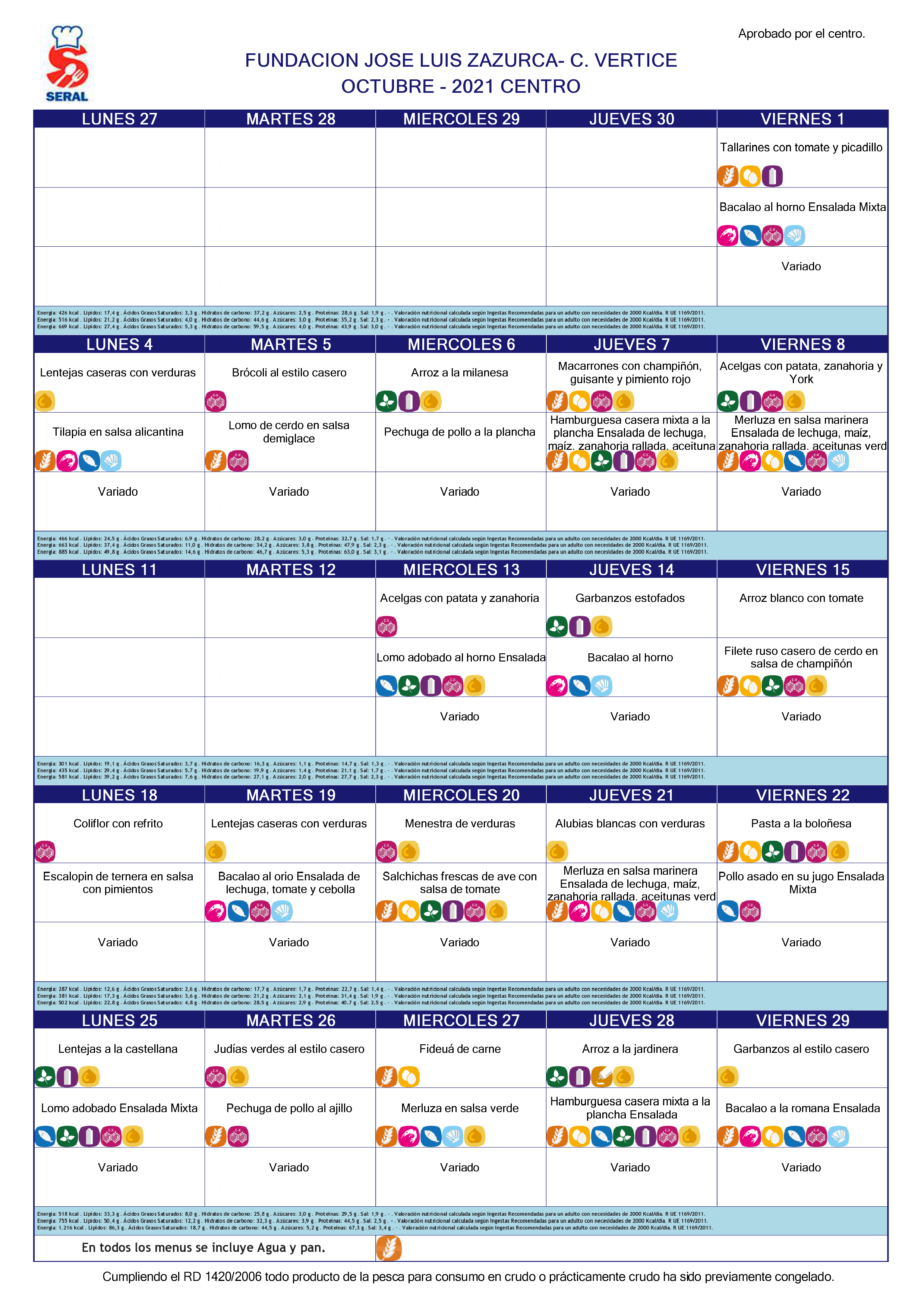 Buenas tardes, os dejamos el menú del mes de Octubre: Recomendaciones e información sobre el aporte nutricional de los menús e información sobre el aporte nutricional de los menús