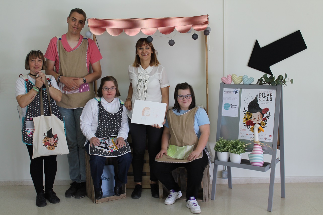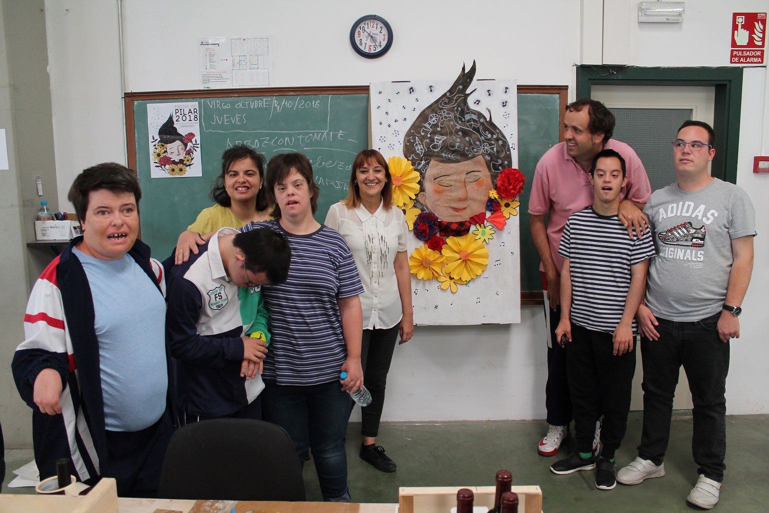 Por si fuera poco, el jueves, 4 de octubre, contamos con una visita muy especial en el centro: de la Chica con flequillo, Mamen Marcén, ilustradora zaragozana creadora del cartel oficial de las fiestas del Pilar 2018. Durante la visita, la artista pudo disfrutar de los murales y las obras que prepararon nuestros chicos, así como de una entrevista por parte del mismísimo equipo de prensa del centro, formado por varios usuarios. “Qué es lo que más te gusta pintar?”, le preguntó uno de los presentes. “Lo que más me gusta es dibujar personajes muy dulces y felices”, respondió ella.