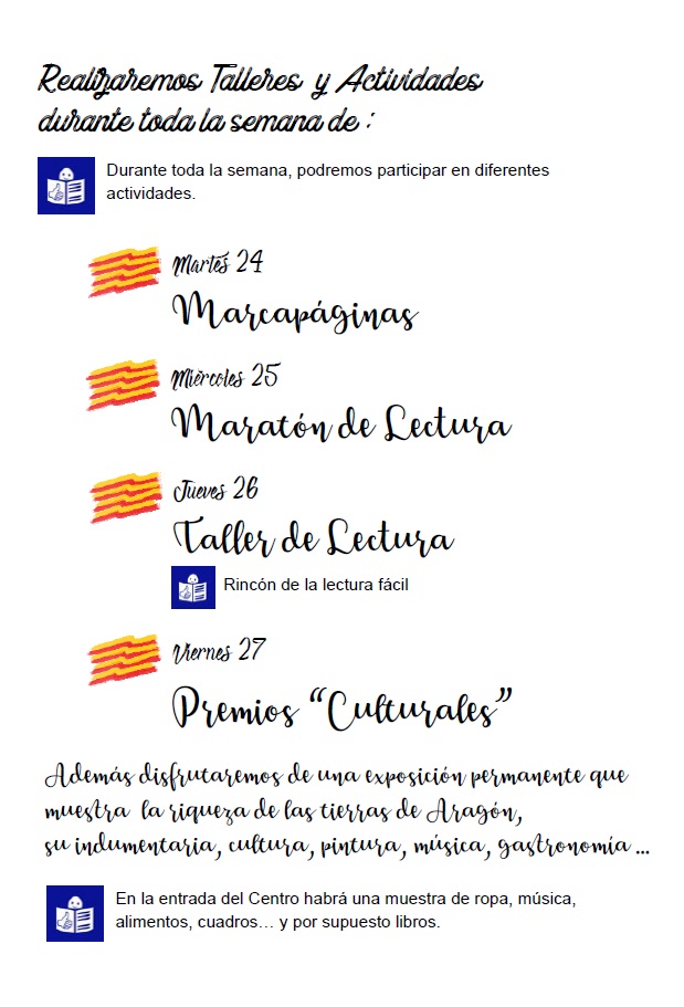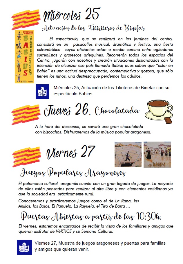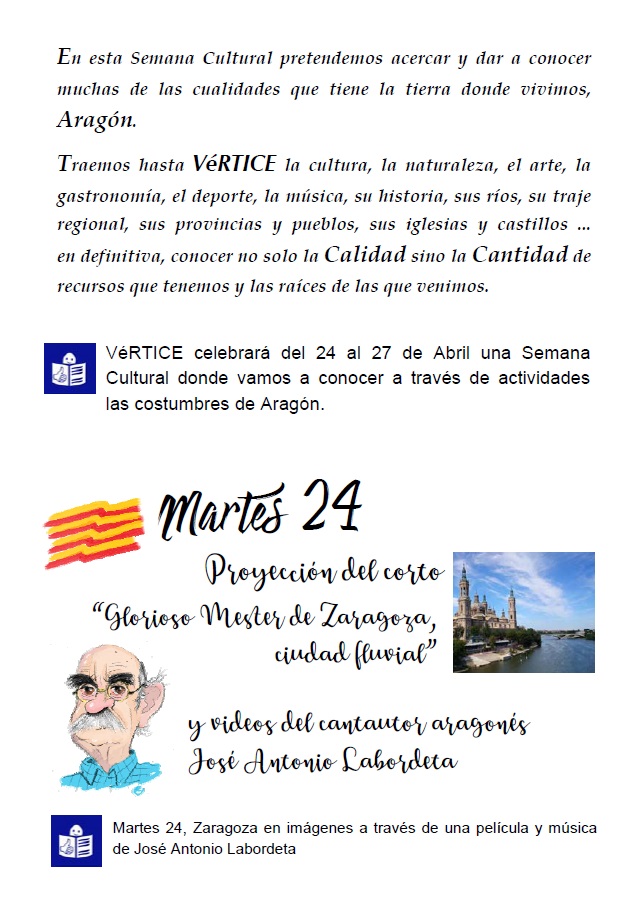 Del 24 al 27 de abril de 2018, el Centro Vértice de la Fundación José Luis Zazurca de Zaragoza presenta su ‘Semana Cultural Vértice’ en honor a la festividad del Día de San Jorge. Tres jornadas protagonizadas por proyecciones, talleres artísticos, actividades lúdico-festivas y la actuación estelar de Los Titiriteros de Binéfar. ¿El objetivo? Dar a conocer los atributos y peculiaridades de la tierra a los usuarios de la instalación, y a sus familares y amigos. ¿Te lo vas a perder?