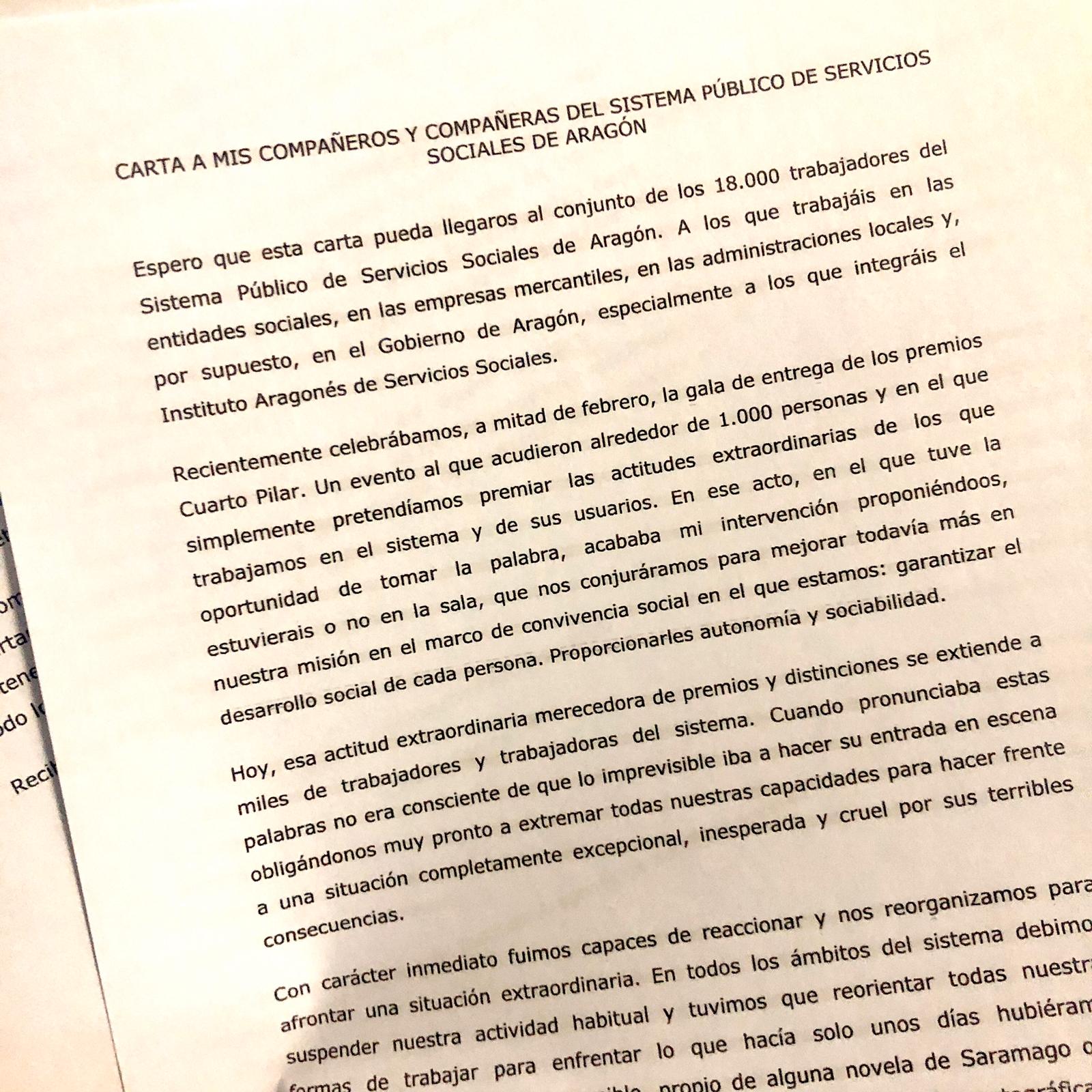 Espero que esta carta pueda llegaros al conjunto de los 18.000 trabajadores del Sistema Público de Servicios Sociales de Aragón. A los que trabajáis en las entidades sociales, en las empresas mercantiles, en las administraciones locales y, por supuesto, en el Gobierno de Aragón, especialmente a los que integráis el Instituto Aragonés de Servicios Sociales.